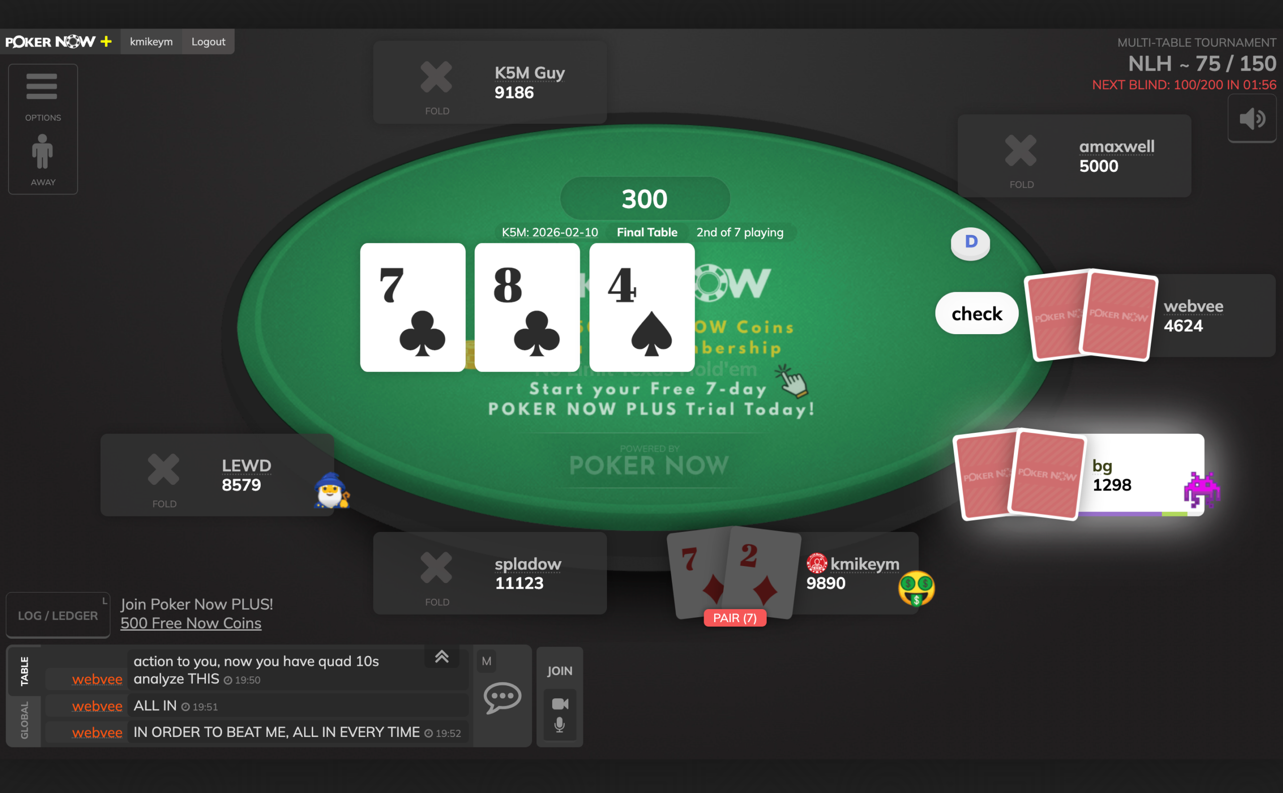 Then it was heads-up against Thomas for first place. Down to 385 chips and nearly dead. Spiked a King on the turn to double up against spladow’s pocket tens. Fought back to nearly even. A true battle between man and machine!