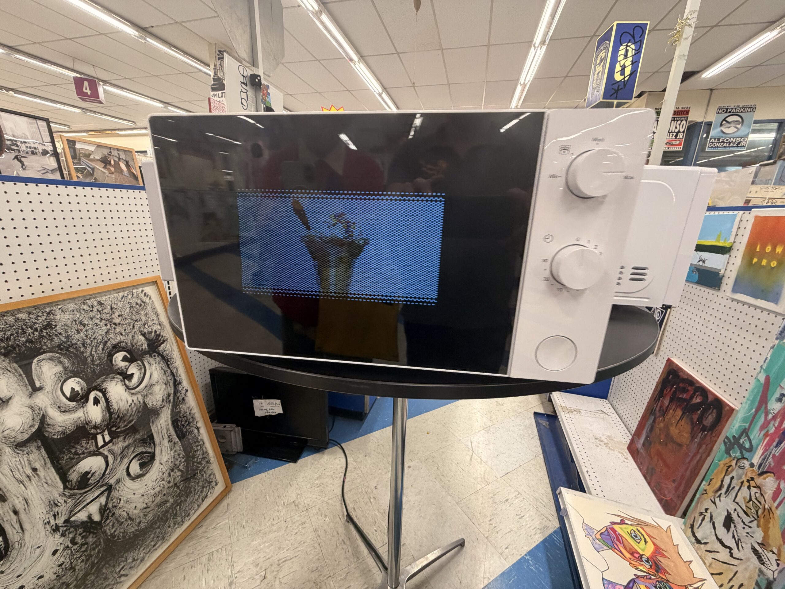 Stand in front of it long enough and the piece starts to loop. You’re watching screens on microwaves spinning on a platter, displaying video of things spinning on platters inside microwaves. Observer and observed collapse into each other. You’re doing the same thing the machine is doing: standing still, watching something rotate, waiting.